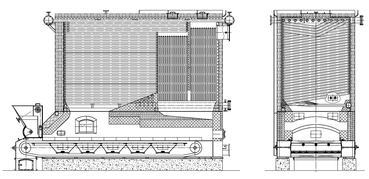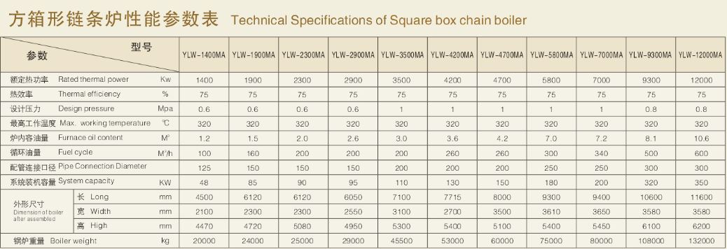 YLW organic heat-medium boiler is the packaged forced circulation chain grate boiler. Front section of boiler body is the hearth radiation heating area consisting of closely-aligned double-square coils. The rear section is the convection flush heating area of coil tube bank. Boiler is structured into the body drum on the combustion hot fume chamber. Heat from the boiler is used to heat the air as required for the boiler combustion in the air pre-heater. Then fume exhausts outside with chimney via the dust collector and draught fan.